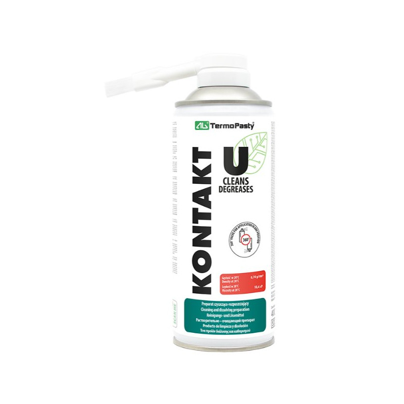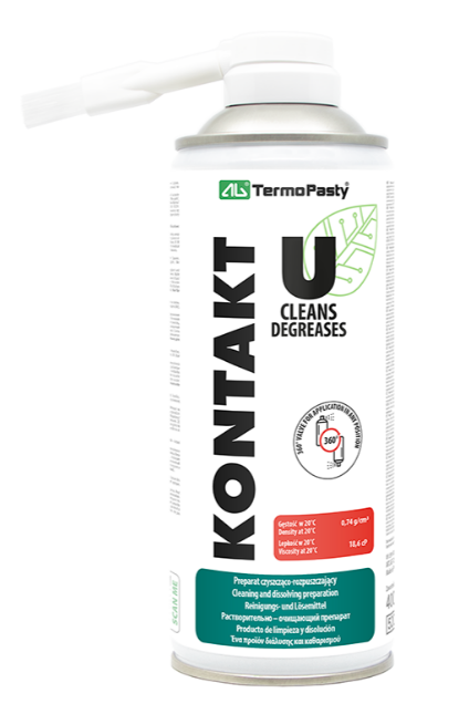 Kontakt U charakteryzuje się transparentną barwą i ostrym, alkoholowym zapachem, co jest typowe dla rozpuszczalników wysokiej jakości. Jego gęstość wynosi 0,74 g/cm³ przy temperaturze 20°C, co świadczy o jego stosunkowo lekkiej konsystencji, idealnej do aplikacji na elementy elektroniczne. Lepkość preparatu to 18,6 cP w tej samej temperaturze, co zapewnia odpowiednią fluidność, ułatwiając rozprowadzanie produktu nawet w trudno dostępnych miejscach.