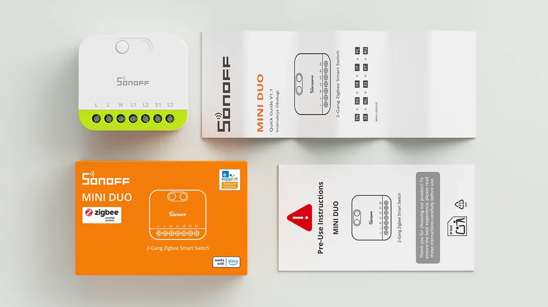 SONOFF MINI DUO to kompaktowy moduł dopuszkowy, który zamienia klasyczne przełączniki w inteligentne punkty sterowania. Sprawdzi się zarówno w prostych instalacjach oświetleniowych, jak i w rozbudowanych systemach automatyki domowej opartych o Zigbee 3.0.