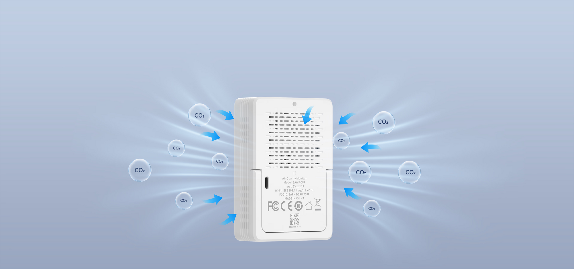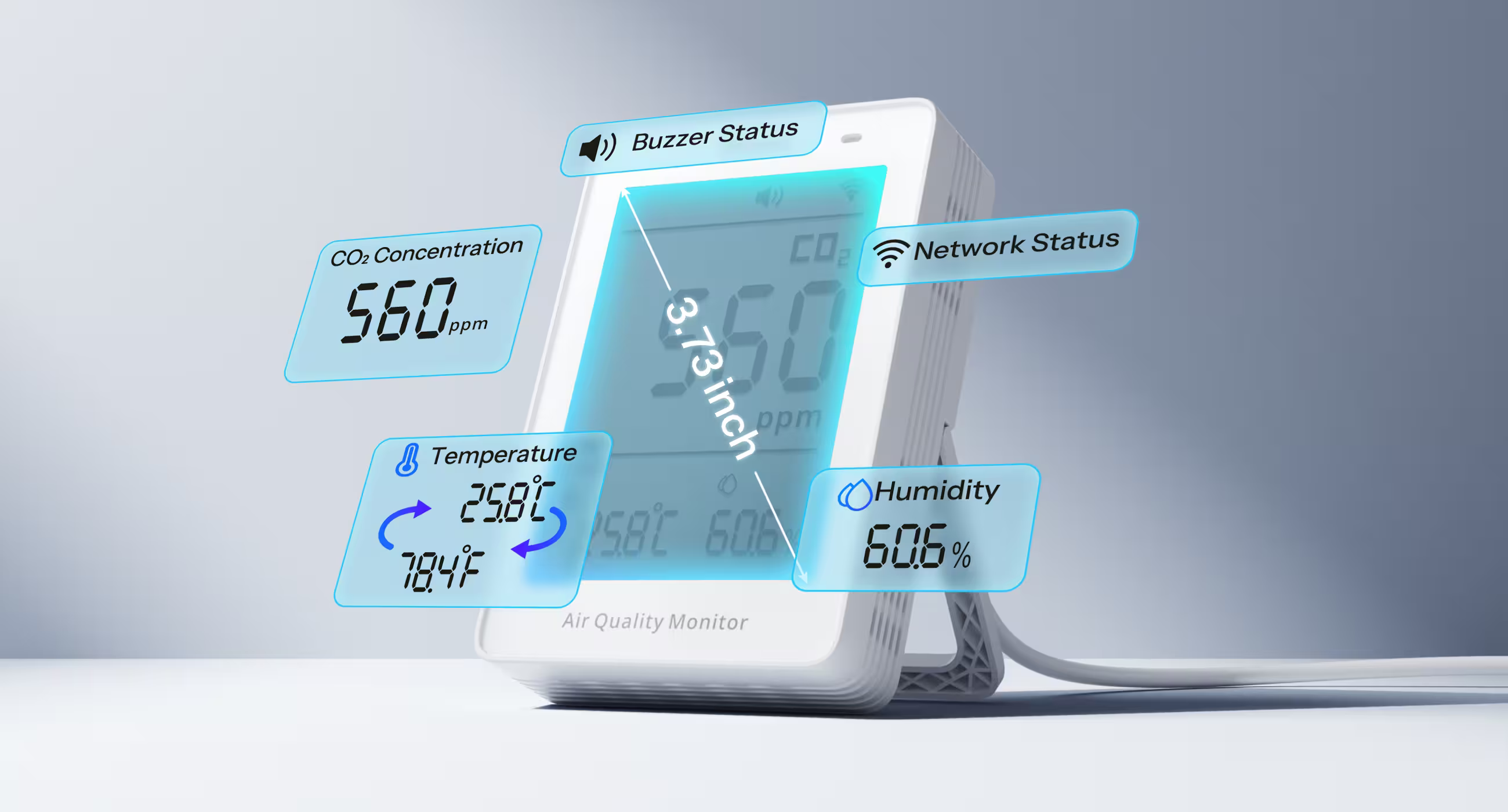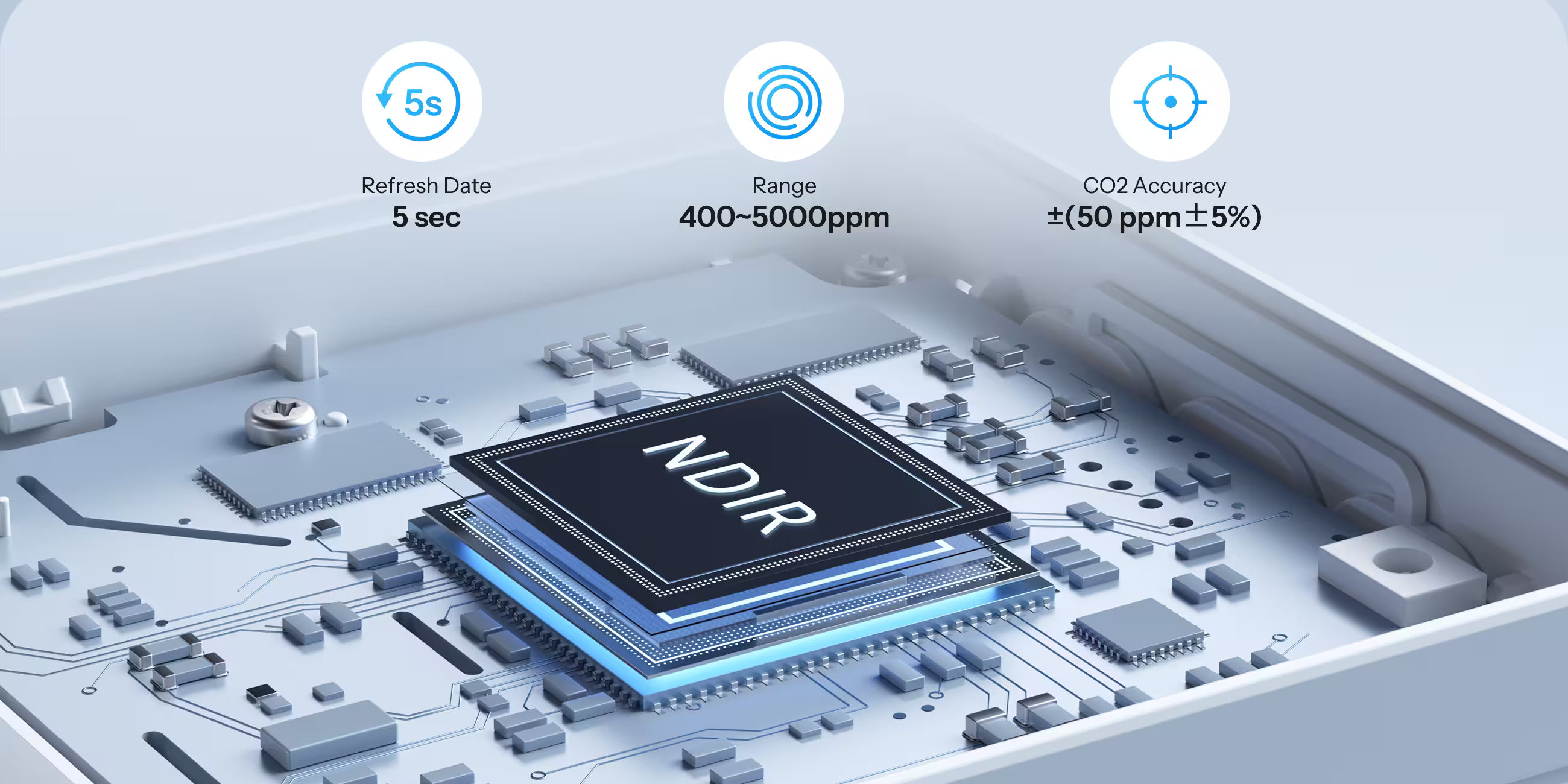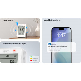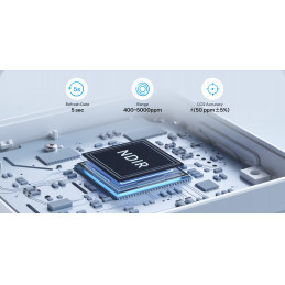 Dzięki wbudowanemu czujnikowi NDIR, monitor CO₂ gwarantuje dokładność ±(50ppm + 5%). Ciągłe zasilanie pozwala na aktualizację odczytów co 5 sekund.