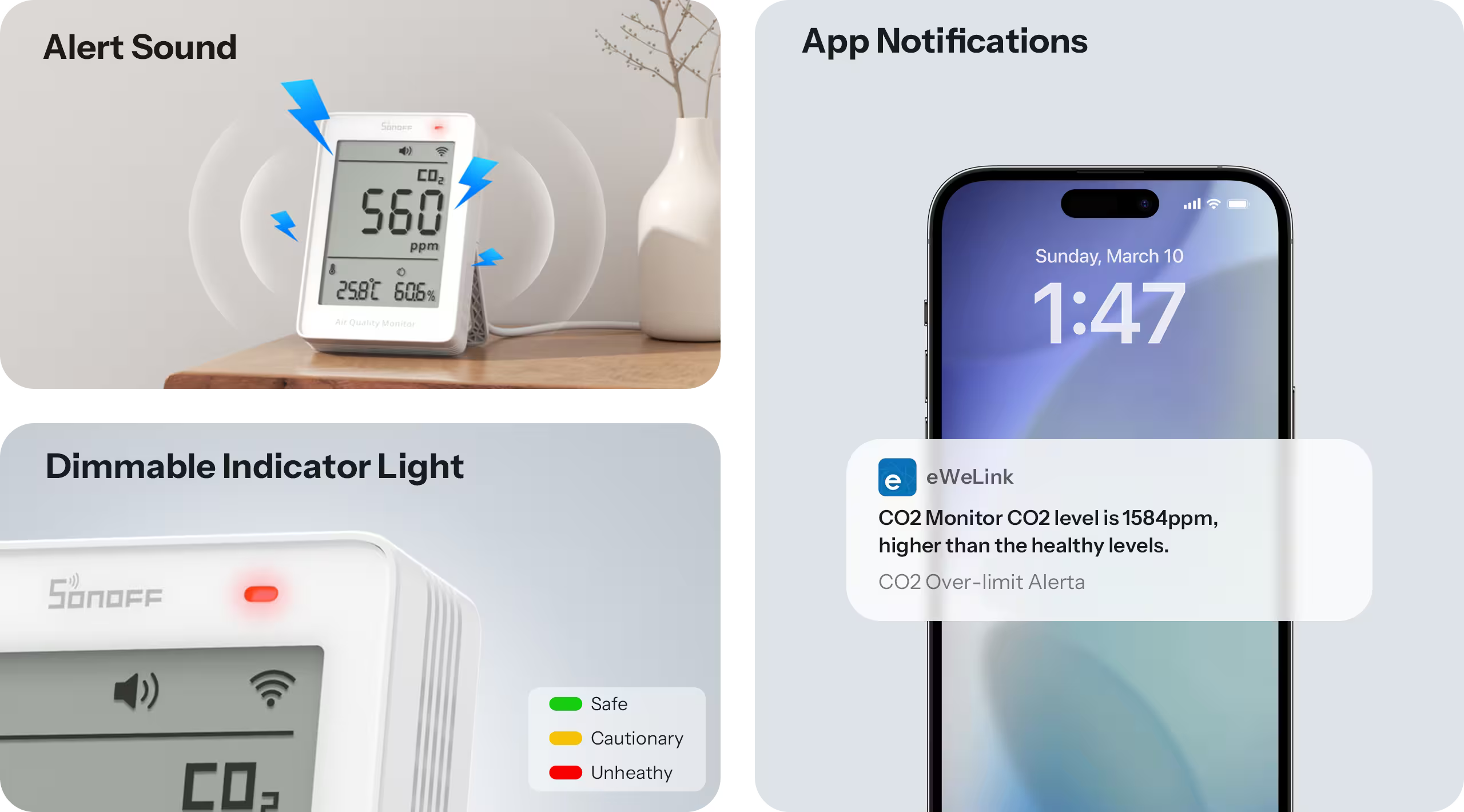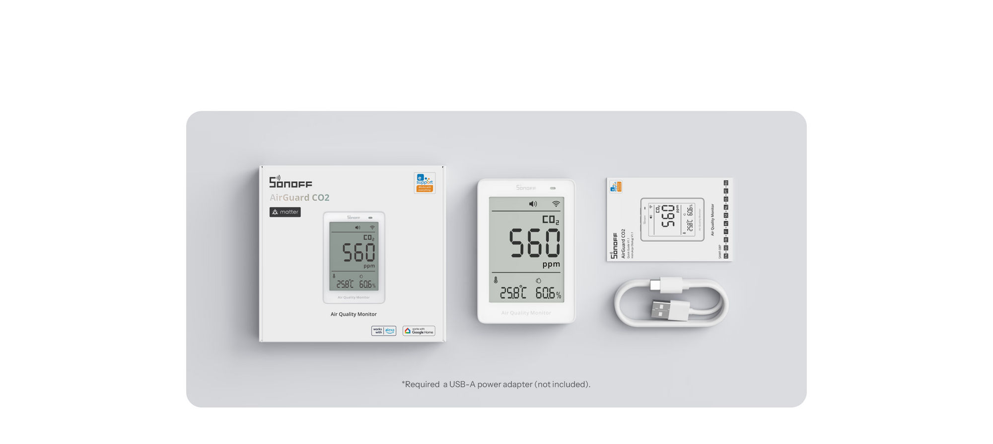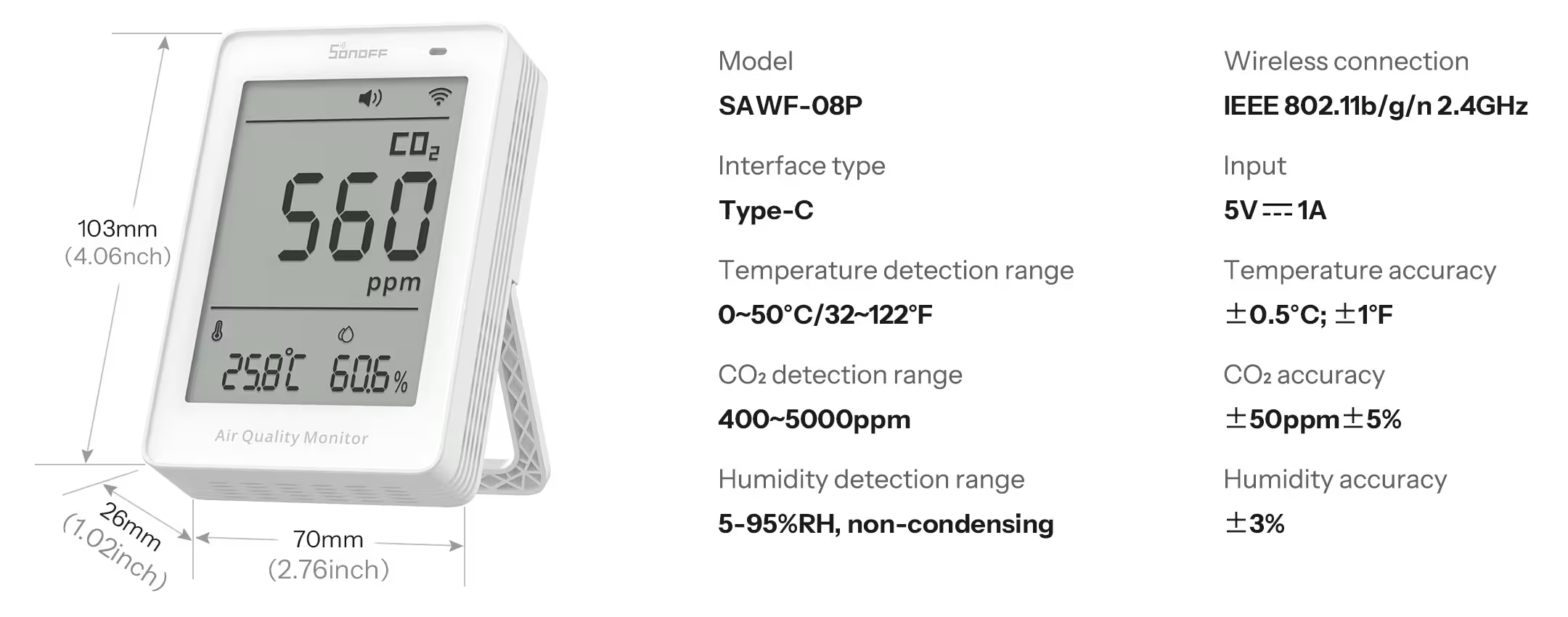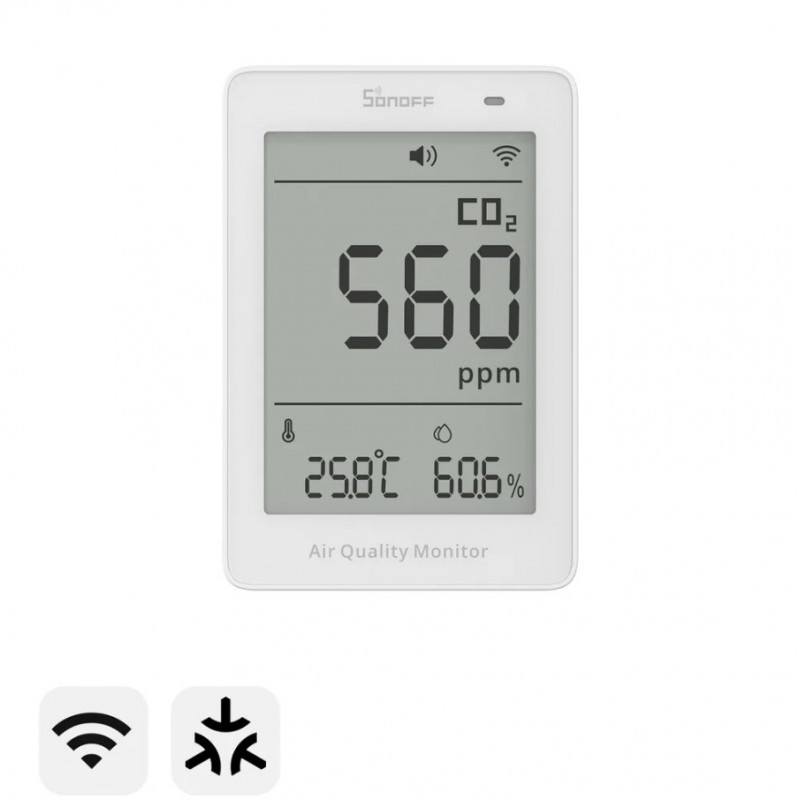 Monitor jakości powietrza SONOFF AirGuard: pomiar PM2.5/PM10, temp., wilg., odświeżanie co 2s, integracja Matter.