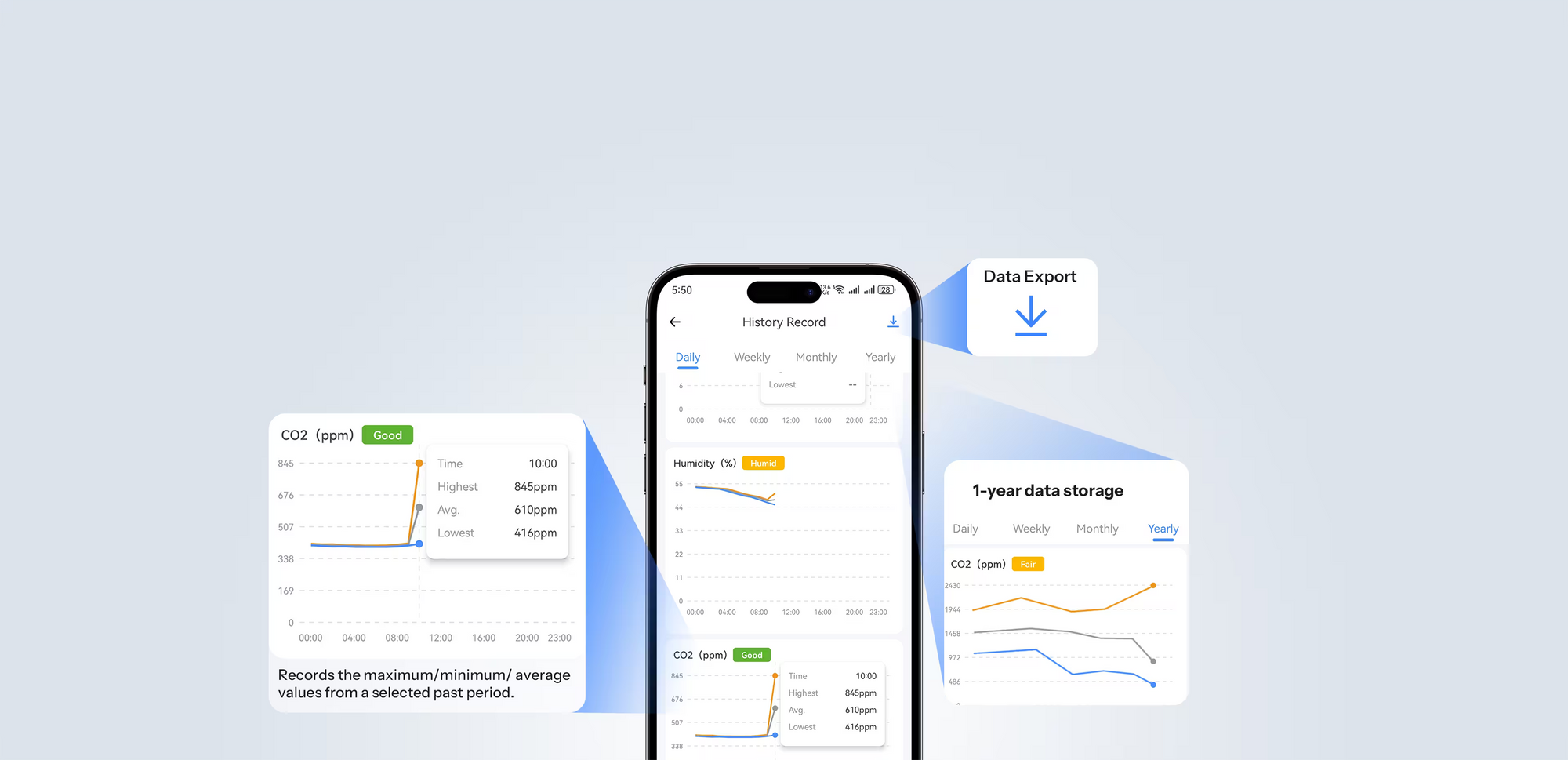 Dostęp do 365 dni historii pomiarów CO2, temperatury i wilgotności.