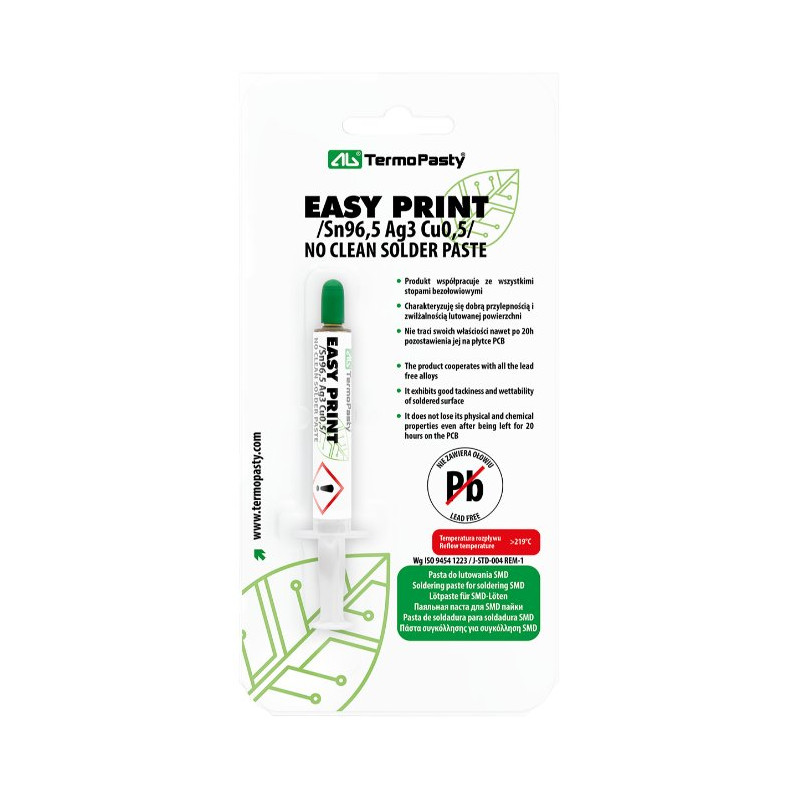 Pasta lutownicza Easy Print to wysokiej jakości produkt opracowany z myślą o lutowaniu bezołowiowym SMD. Skład stopu (96,5% cyny, 3% srebra, 0,5% miedzi) zapewnia trwałe, niezawodne i czyste połączenia, a formuła No Clean eliminuje konieczność mycia po lutowaniu.