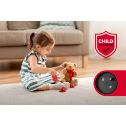Przedłużacz zasilający Rebel wyposażony został we wbudowane przesłony ochronne styków w gniazdach sieciowych. Dzięki temu skutecznie dba o zdrowie i życie najmłodszych, chroniąc ich przed wkładaniem palców lub innych przedmiotów.