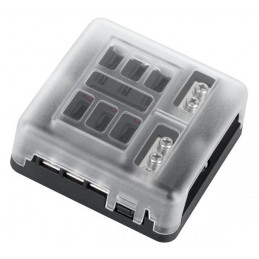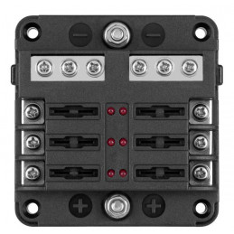 Skrzynka bezpieczników samochodowa FB-6 z wbudowanymi diodami LED to solidne rozwiązanie do zarządzania instalacjami elektrycznymi. Zintegrowana szyna ujemna umożliwia uporządkowane podłączenie masy, a sygnalizacja LED pozwala szybko zlokalizować przepalony bezpiecznik.