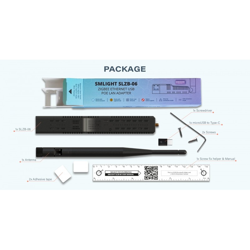 Adapter SLZB-06 można przymocować do ściany lub innego dowolnego miejsca za pomocą dwustronnej taśmy klejącej lub wkrętów. Oba elementy znajdują się w zestawie.