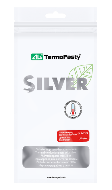 AG Silver to pasta termoprzewodząca została wzbogacona o związki srebra wpływające na wzrost poziomu przewodności cieplnej. Produkt wyróżnia także niska impedancja termiczna. Warto pokryć nim mikroszczeliny znajdujące się pomiędzy radiatorami a procesorami CPU, GPU bądź innymi podzespołami. Pasta AG Silver jest również przydatna w przypadku przekazywania ciepła ze skraplaczy rurek do wymienników wewnątrz kolektorów słonecznych. Użyteczność preparatu potwierdza norma RoHS, w zgodzie z którą go wyprodukowano.