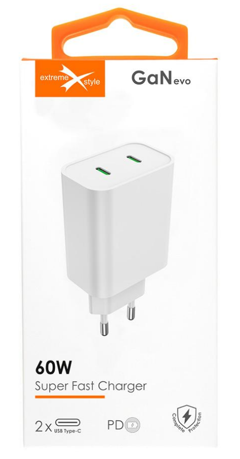 Kompaktowa ładowarka sieciowa eXtremestyle® GaN evo z dwoma portami USB Typ-C, przeznaczona do szybkiego i bezpiecznego ładowania urządzeń zasilanych przez USB. Technologia GaN zapewnia wysoką wydajność przy niewielkich wymiarach.