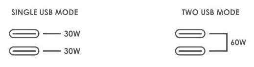 Przy jednoczesnym ładowaniu dwóch urządzeń całkowita moc wynosi 60 W - po 30 W na każdy port.